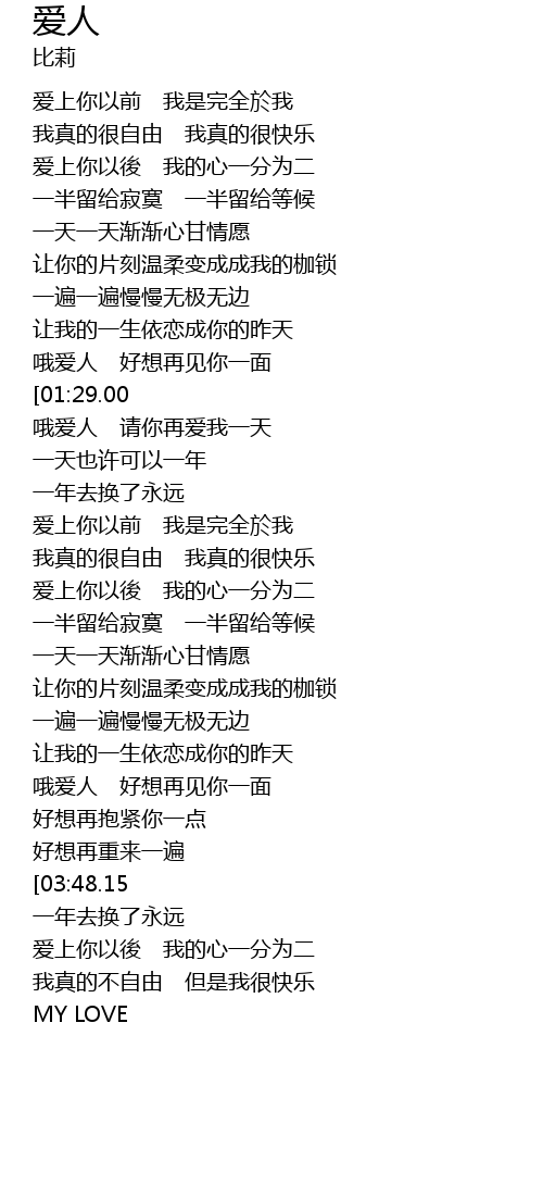 | [03:40.15][03:48.15] | 哦爱人 请你再爱我一天一天也许可以一年 |