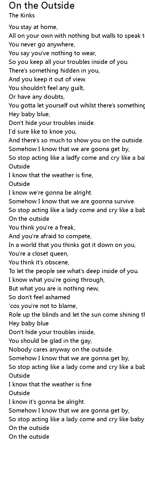 So stop acting like a ladfy come and cry like a baby on the outside |