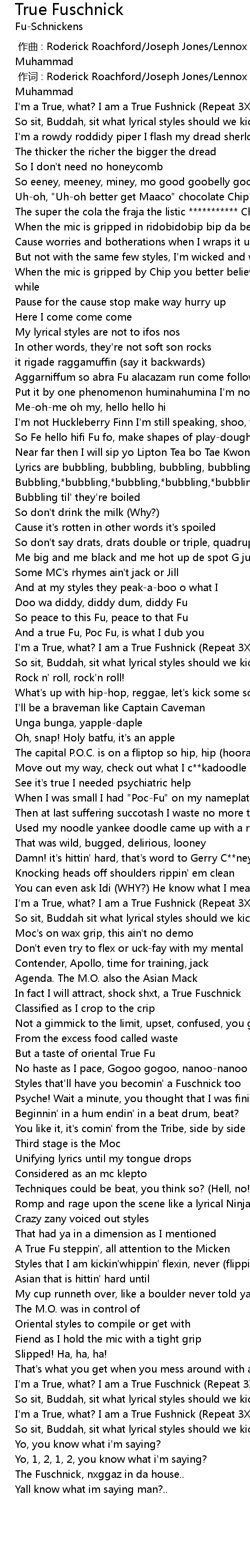 | [02:09.60] | I'm a True, what? I am a True Fushnick (Repeat 3X) |