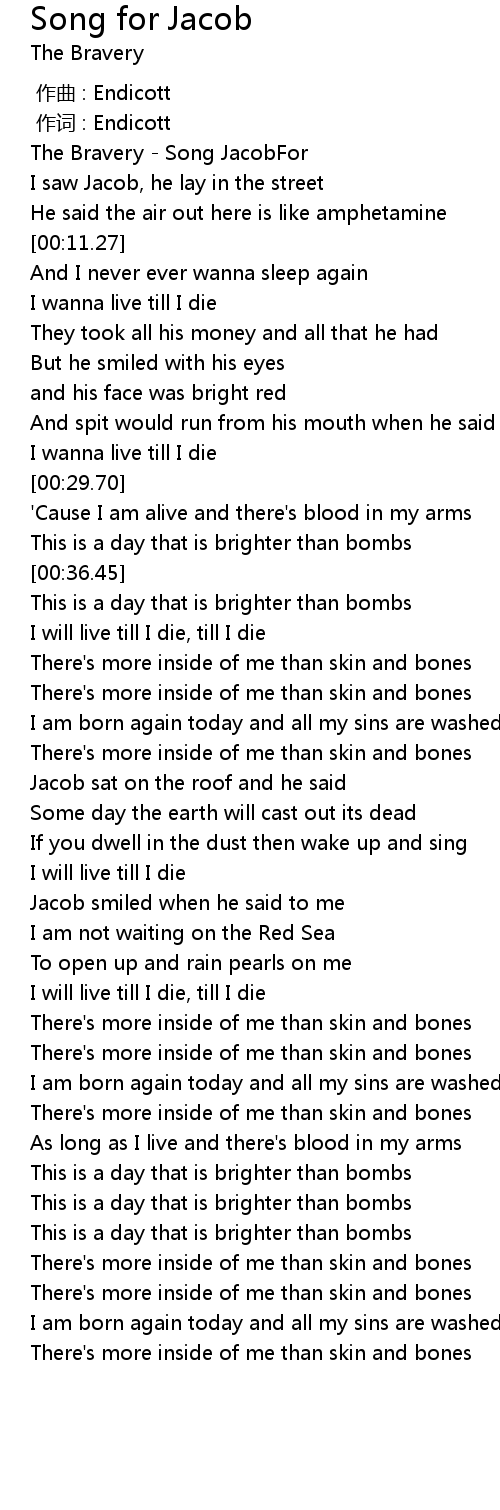 | [00:06.64] | I saw Jacob, he lay in the street |