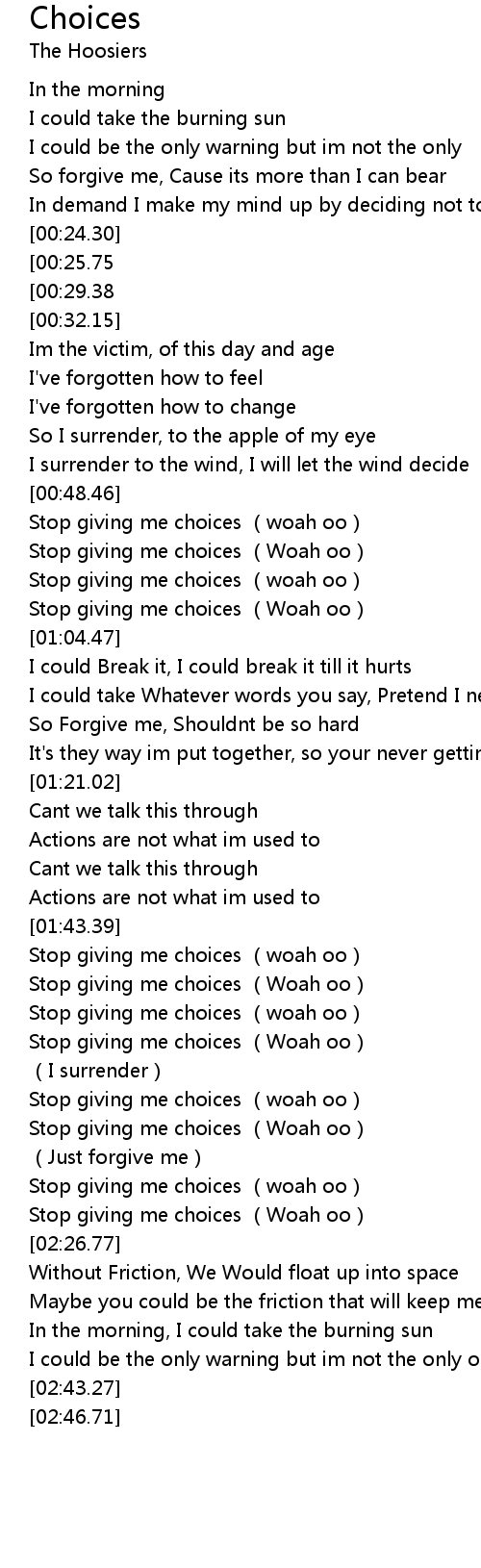 | [00:49.54] | Stop giving me choices woah oo |