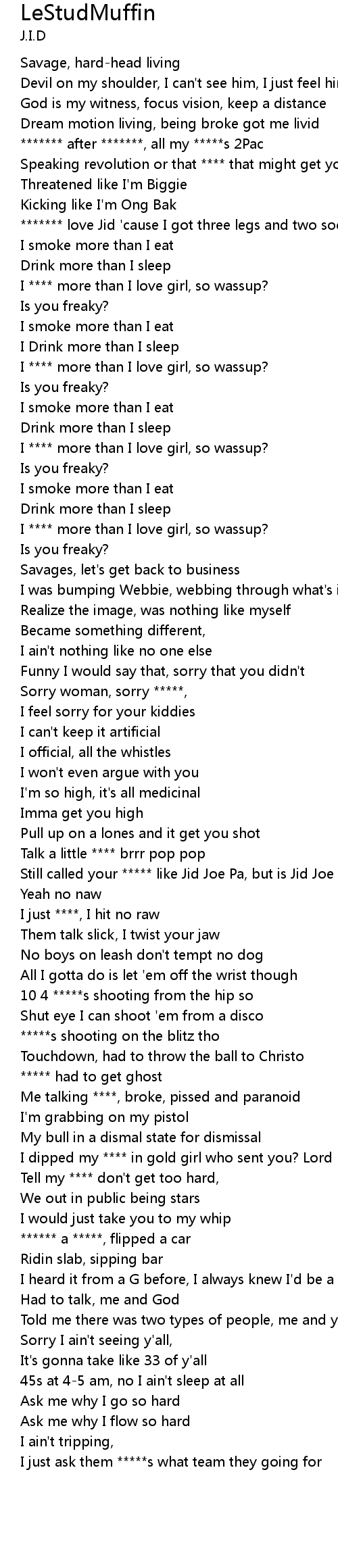 | [02:05.19] | Still called your ***** like Jid Joe Pa, but is Jid Joe Pa |