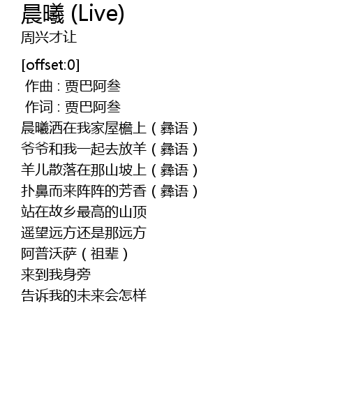 | [00:02.42] | 晨曦洒在我家屋檐上(彝语) |