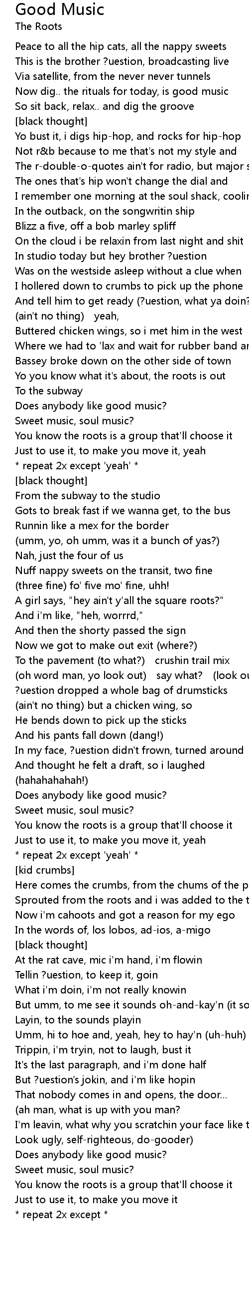 | You know the roots is a group that'll choose it | |