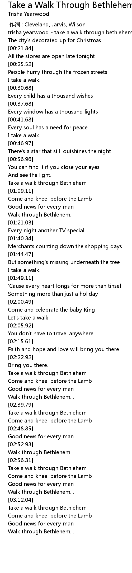 | [00:00.96] | trisha yearwood take a walk through bethlehem |