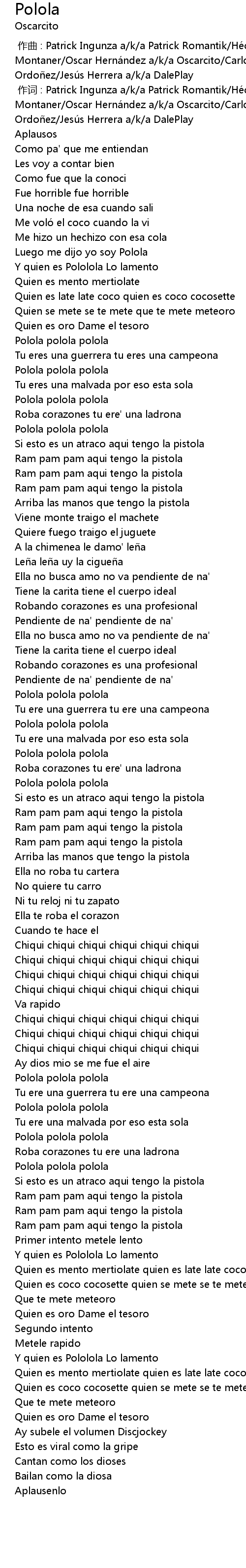 | [00:00.008] | zuò cí : Patrick Ingunza a k a Patrick Romantik Hé ctor Montaner Oscar Herná ndez a k a Oscarcito Carlos " Chiky" Brice o Alfonso Ordo ez Jesú s Herrera a k a DalePlay |
