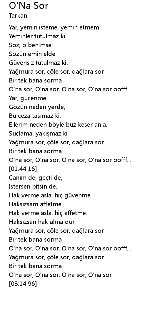 | [02:58.66] | Yağmura sor, çöle sor, dağlara sor |