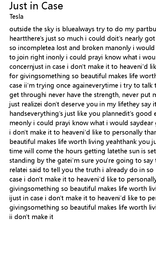 outside the sky is bluealways try to do my partbut now it's raining in my heartthere's just so much i could doit's nearly got ahold of meit's why i feel so incompletea lost and broken manonly i would understandi'd be more than glad to join right inonly i could prayi know what i would sayto whom it may concernjust in case i don't make it to heaveni'd like to personally thank you for givingsomething so beautiful makes life worth living yeahthank you just in case ii'm trying once againeverytime i try to talk toit's like i never seem to get throughi never have the strength, never put my faith in youmaybe i should just realizei don't deserve you in my lifethey say it's in your handseverything's just like you plannedit's good enough for them, so why not meonly i could prayi know what i would saydear god i'm talking to yajust in case i don't make it to heaveni'd like to personally thank you for givingsomething so beautiful makes life worth living yeahthank you just in case isoon enough my time will come the hours getting latethe sun is setting fast and you'll be standing by the gatei'm sure you're going to say to me son why couldn't you just relatei said to tell you the truth i already do in so many other waysjust in case i don't make it to heaveni'd like to personally thank you for givingsomething so beautiful makes life worth living yeahthank you just in case ijust in case i don't make it to heaveni'd like to personally thank you for givingsomething so beautiful makes life worth living yeahthank you just in case ii don't make it |