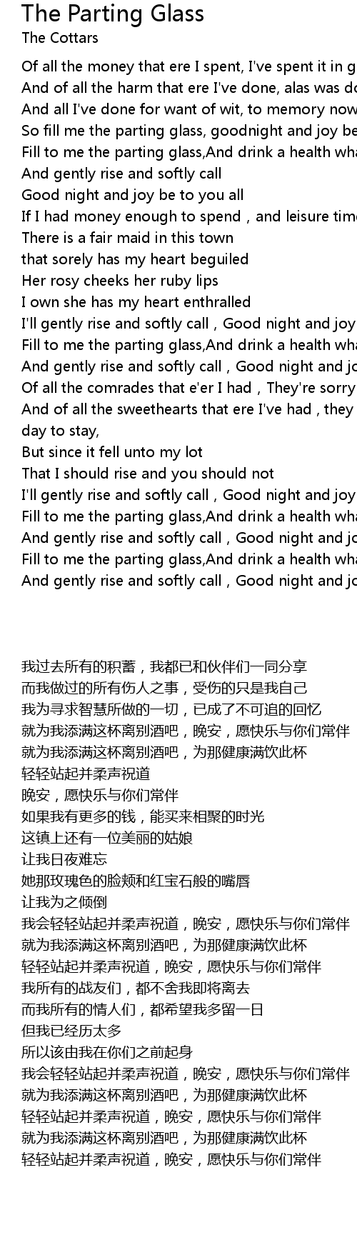 | [00:36.69] | So fill me the parting glass, goodnight and joy be with you all |