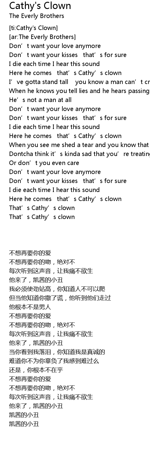 | [00:31.65] | Here he comes that' s Cathy' s clown |