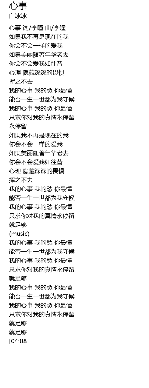 | [00:00] | 心事 词/李瞳 曲/李瞳 |