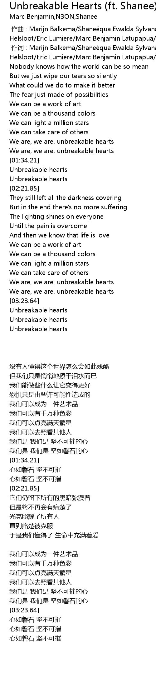 | [03:15.97] | We are, we are, unbreakable hearts |