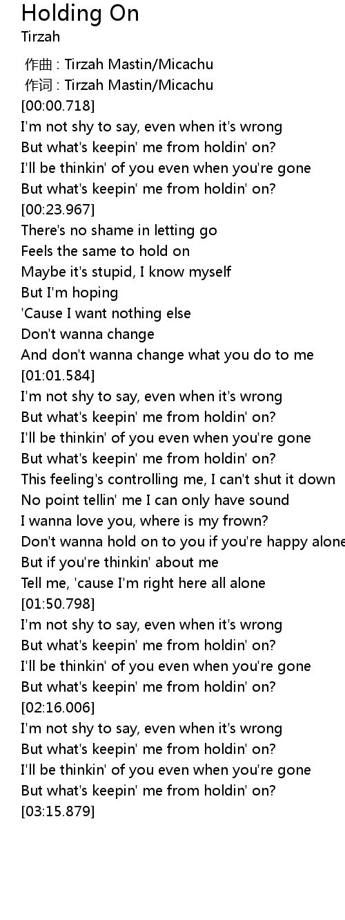 | [00:20.545] | But what' s keepin' me from holdin' on? |