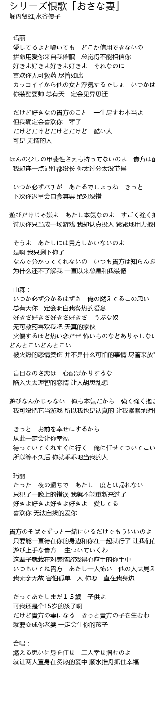 | 燃える思いに身を任せ 二人幸せ掴むのよ | |