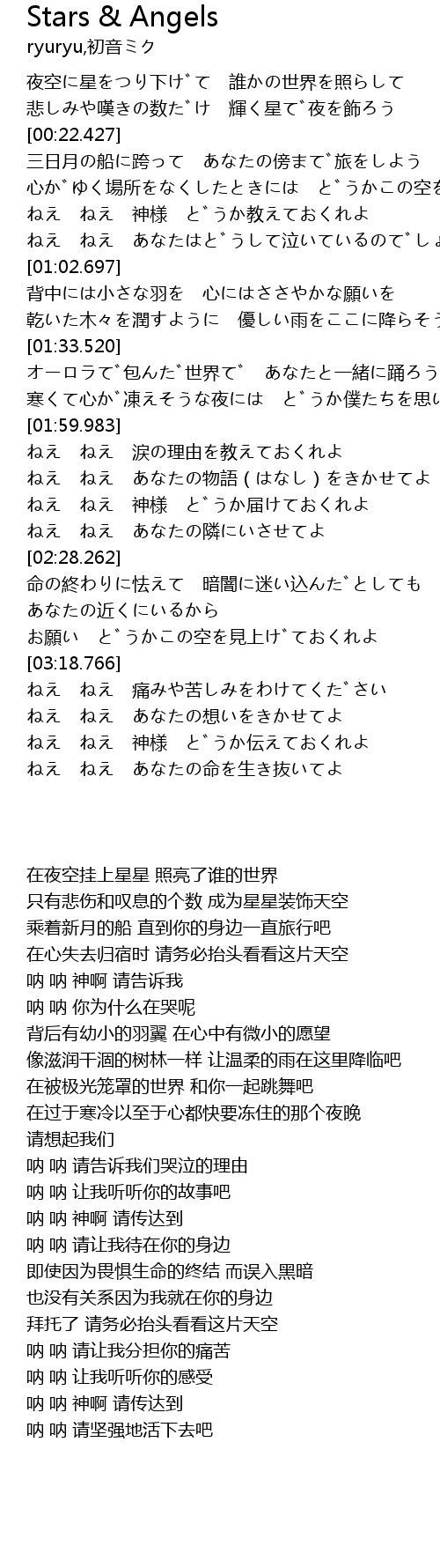 | [00:05.988] | 夜空に星をつり下げて 誰かの世界を照らして |