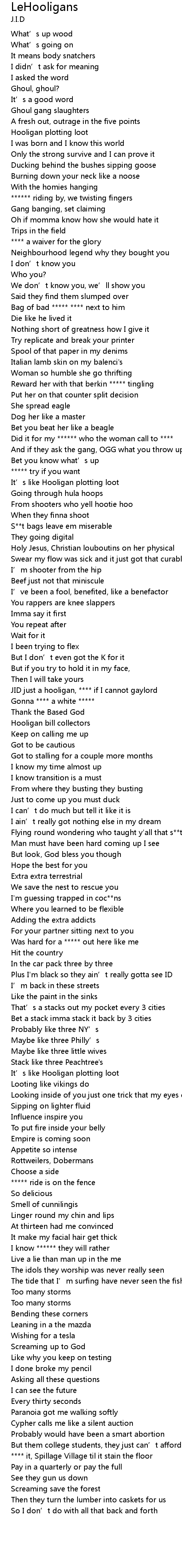| [02:18.02] | JID just a hooligan, **** if I cannot gaylord |