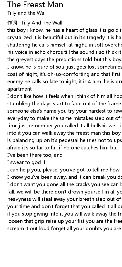 | I don' t want you gone all the cracks you see can be repaired and if you start to fall, we will be there don' t drown yourself in all your old regrets because that heavyness will steal away your breath step out of that life it' s nowhere near your time and don' t forget that you called it all bullshit well it still is and if you stop giving into it you will walk away the freest man shake your head loosen that grip raise up your fist you are the freest man open your mouth scream it out loud forget all your doubts you are the freest man |