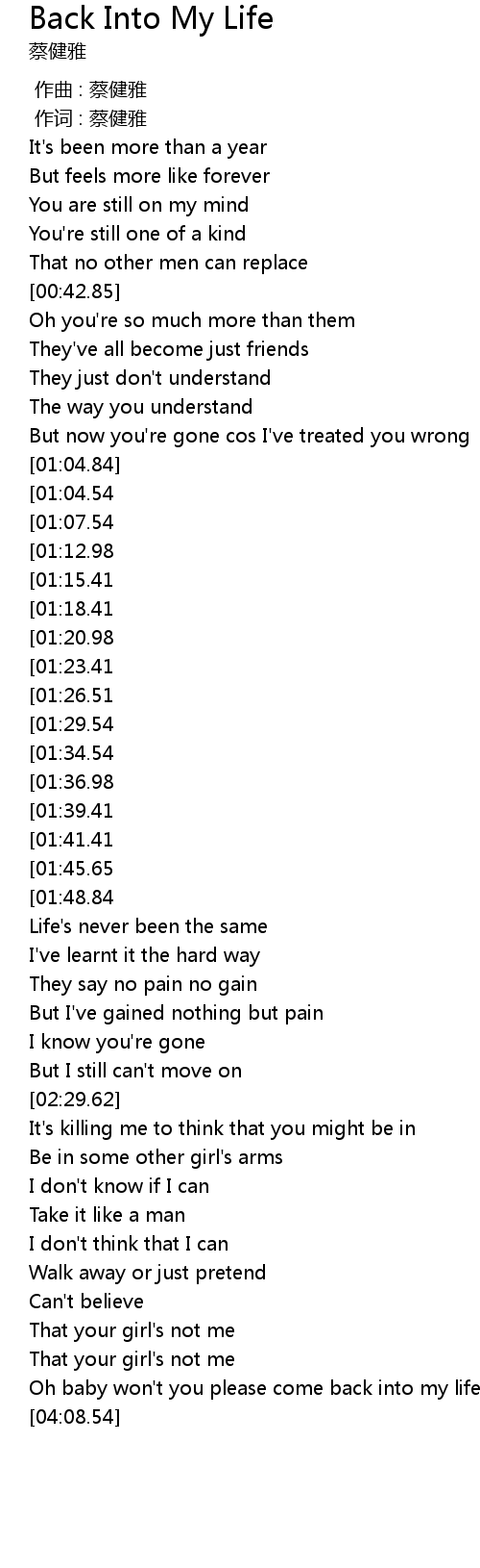 | [04:00.51] | Oh baby won't you please come back into my life |