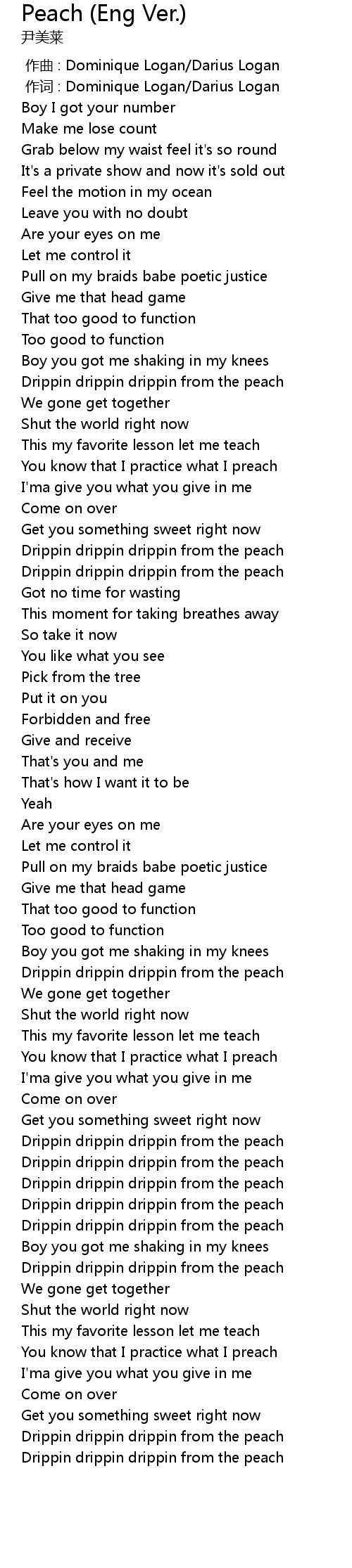 | [01:29.91] | Drippin drippin drippin from the peach |