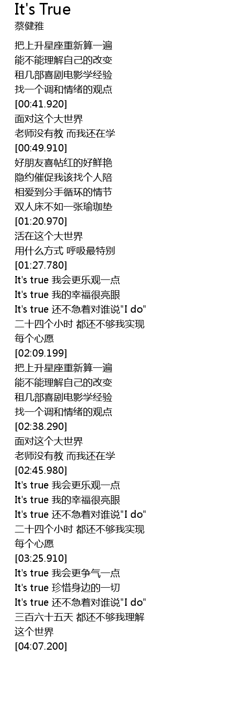 | [03:46.600] | It' s true hai bu ji zhe dui shui shuo" I do" |