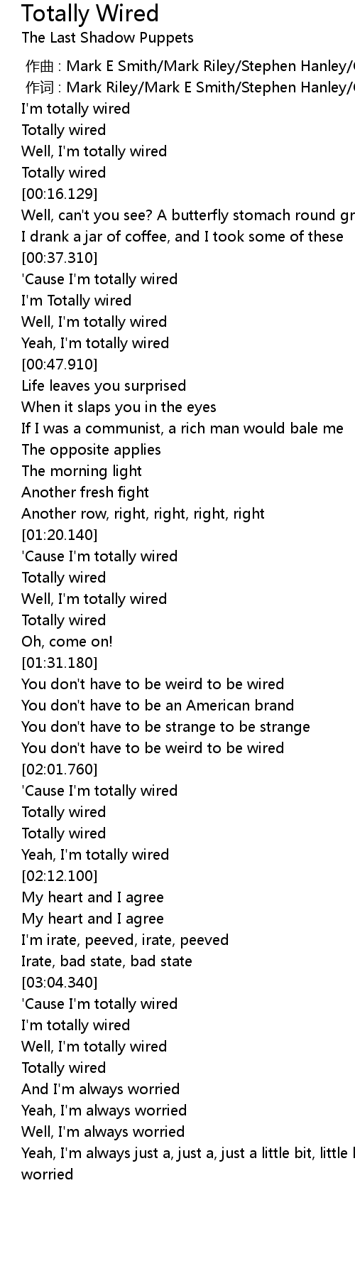 | [00:01.000] | 作词 : Mark Riley/Mark E Smith/Stephen Hanley/Craig Scanlan |