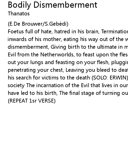 | Foetus full of hate, hatred in his brain, Termination on his mind Destroying the inwards of his mother, eating his way out of the womb Final stage of bodily dismemberment, Giving birth to the ultimate in malevolence Unleashing all the Evil from the Netherworlds, to feast upon the flesh of every living soul Tearing out your lungs and feasting on your flesh, plugging out your eyes and penetrating your chest, Leaving you bleed to death all by yourself, continuing his search for victims to the death SOLO: ERWIN He is the brood of our violent society The incarnation of the Evil that lives in our minds All earthly abuses have led to his birth, The final stage of turning our world into Hell.. REPEAT 1sr VERSE |