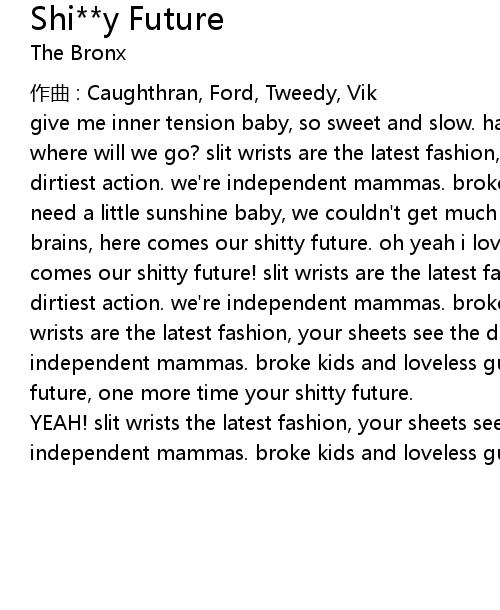 | give me inner tension baby, so sweet and slow. half hearted misdirection, baby where will we go? slit wrists are the latest fashion, and your sheets see the dirtiest action. we' re independent mammas. broke kids and loveless gutters. we need a little sunshine baby, we couldn' t get much weaker. with neon lights for brains, here comes our shitty future. oh yeah i love those neon lights. here comes our shitty future! slit wrists are the latest fashion, your sheets see the dirtiest action. we' re independent mammas. broke kids and loveless gutters slit wrists are the latest fashion, your sheets see the dirtiest action. we' re independent mammas. broke kids and loveless gutters here comes your shitty future, one more time your shitty future. | |