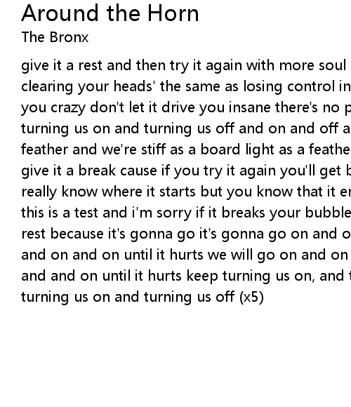 give it a rest and then try it again with more soul until you learn that clearing your heads' the same as losing control in this space don't let it drive you crazy don't let it drive you insane there's no point because you just keep turning us on and turning us off and on and off and on until we're light as a feather and we're stiff as a board light as a feather and we're stiff as a board give it a break cause if you try it again you'll get bored because you don't really know where it starts but you know that it ends with no friends cause even this is a test and i'm sorry if it breaks your bubble but you still need some rest because it's gonna go it's gonna go on and on and on, on and on and on, on and on and on until it hurts we will go on and on and on, on and on and on, on and and on until it hurts keep turning us on, and turning us off you keep turning us on and turning us off (x5) |