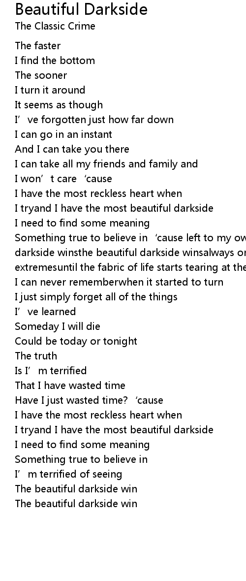 | Something true to believe in‘cause left to my own devicesthe beautiful darkside winsthe beautiful darkside winsalways one for a good timealways one for extremesuntil the fabric of life starts tearing at the seamsand | |