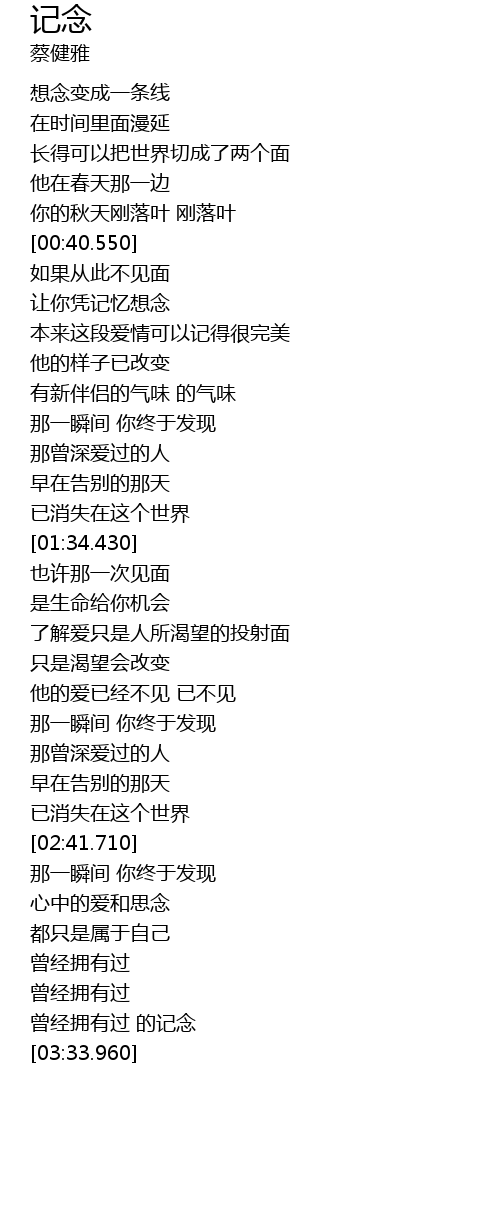 | [03:22.620] | céng jīng yōng yǒu guò de jì niàn |