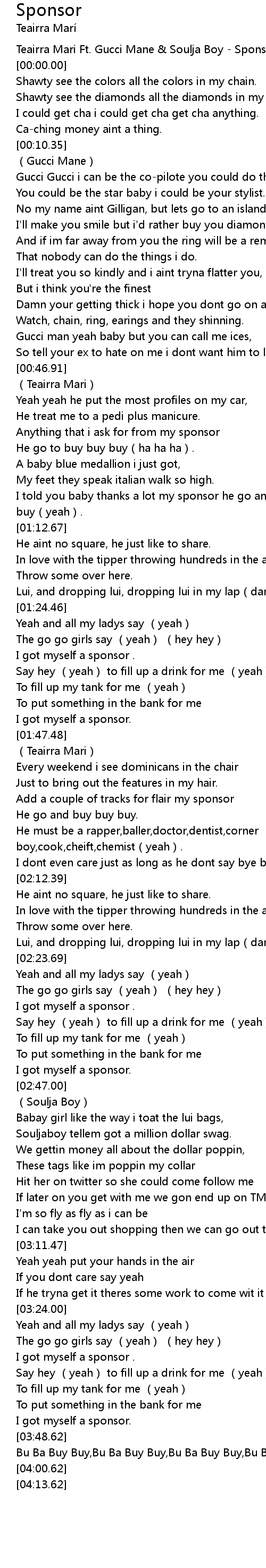 | [00:-7.52] | Teairra Mari Ft. Gucci Mane Soulja Boy Sponsor |