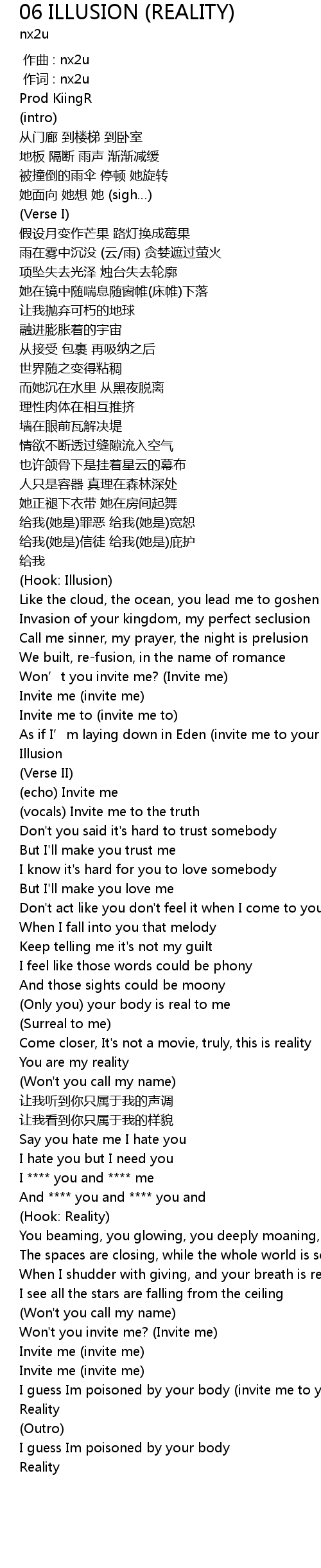 | [02:19:10] | As if I' m laying down in Eden invite me to your illusion |