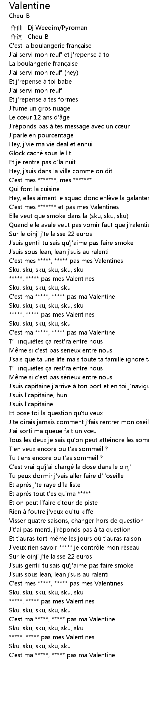 | [03:00.64] | C'est ma *****, ***** pas ma Valentine |