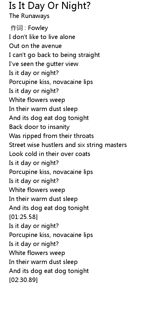 | [00:33.01] | Porcupine kiss, novacaine lips |