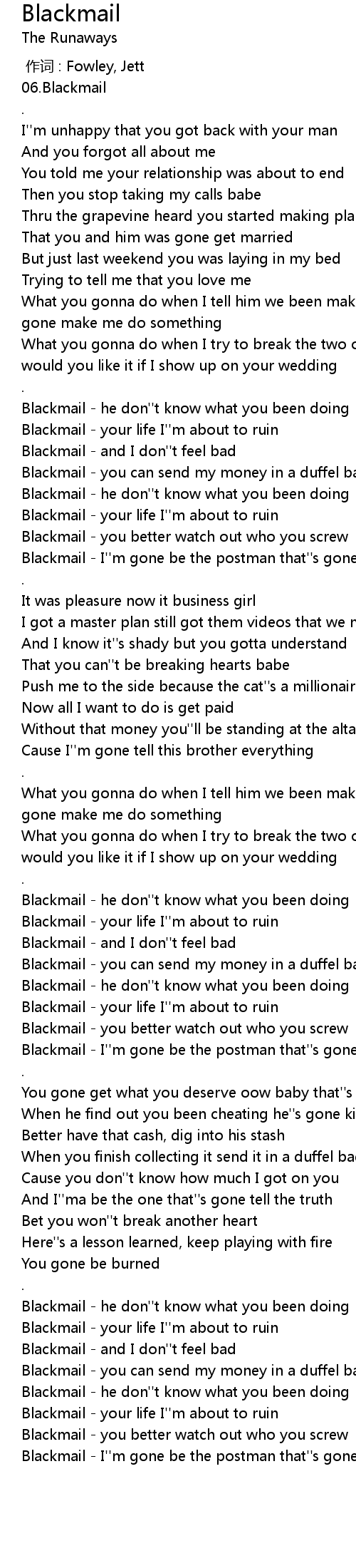 | [00:52.83] | Blackmail - he don''t know what you been doing |