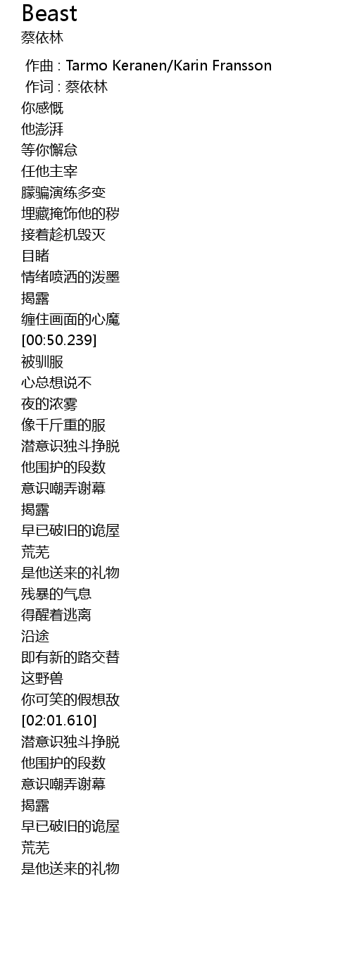| [00:00.00] | 作曲 : Tarmo Keranen/Karin Fransson |