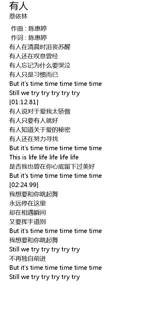 | [01:37.32] | yǒu rén zhǐ yào yǒu rén jiù hǎo |