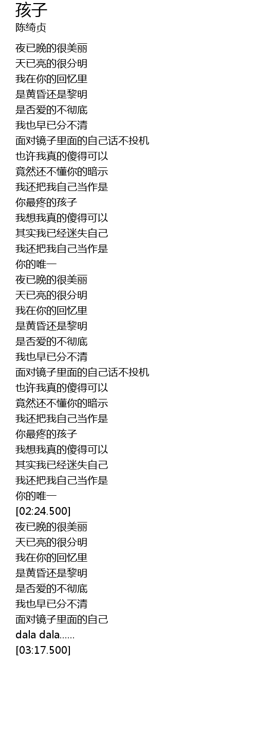 | [02:00.799] | 你最疼的孩子 |