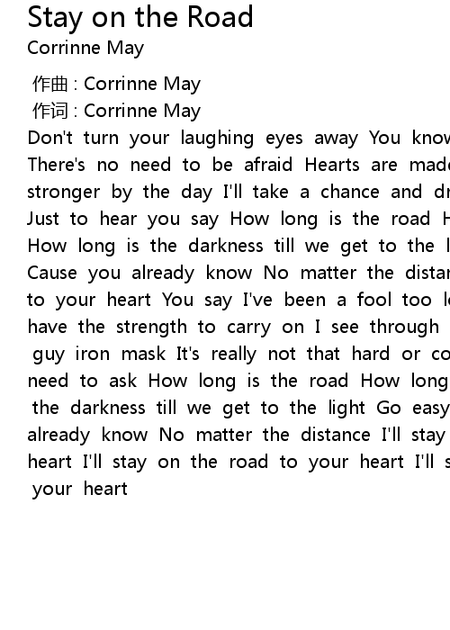 | [00:00.819] | Don't turn your laughing eyes away You know I love you There's no need to be afraid Hearts are made to be broken They get stronger by the day I'll take a chance and drop all my defenses Just to hear you say How long is the road How long is the ride How long is the darkness till we get to the light Go easy on me Cause you already know No matter the distance I'll stay on the road to your heart You say I've been a fool too long You wonder why I have the strength to carry on I see through your weakness Your tough guy iron mask It's really not that hard or complicated There's no need to ask How long is the road How long is the ride How long is the darkness till we get to the light Go easy on me cause you already know No matter the distance I'll stay on the road to your heart I'll stay on the road to your heart I'll stay on the road to your heart |