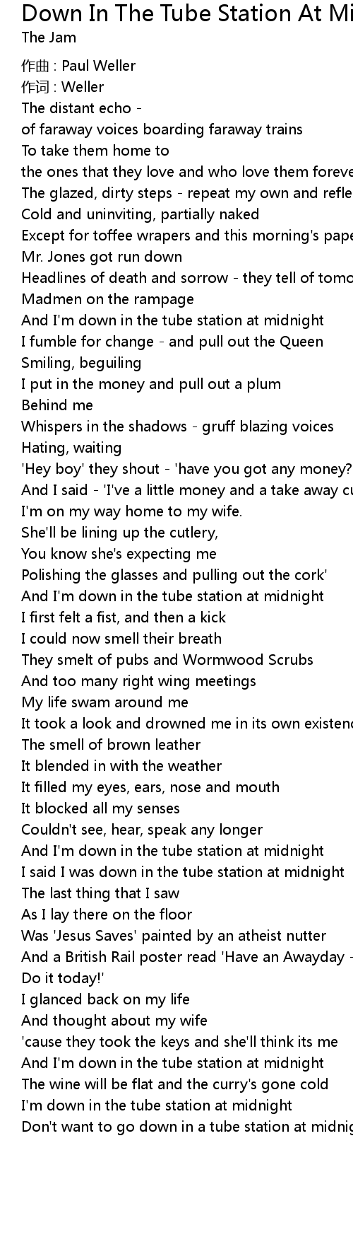 | I' m down in the tube station at midnight | |