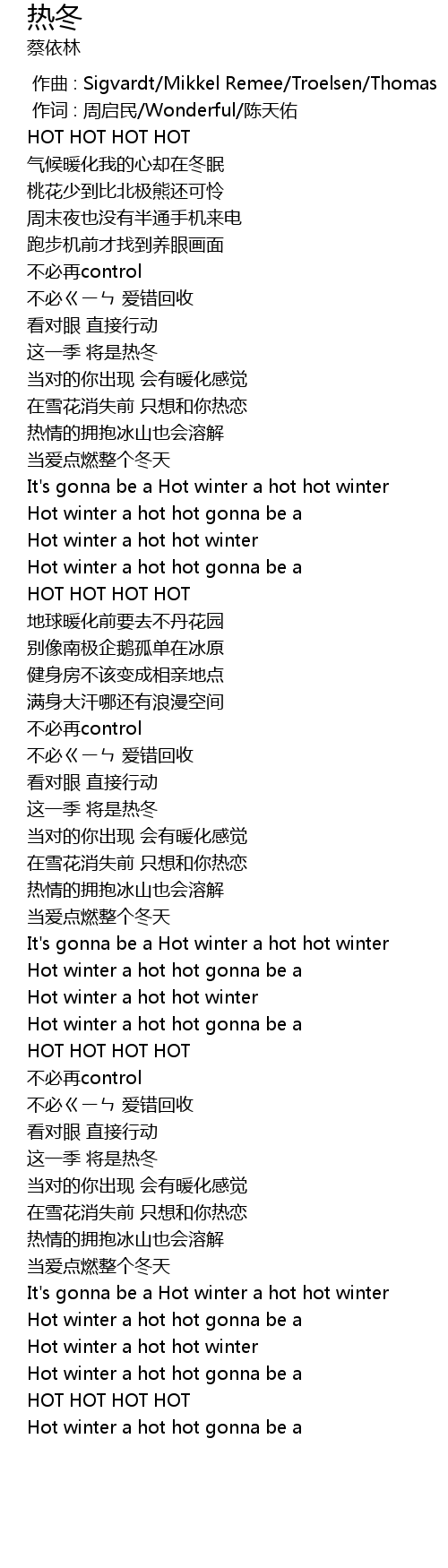 | [02:33.400] | Hot winter a hot hot gonna be a |