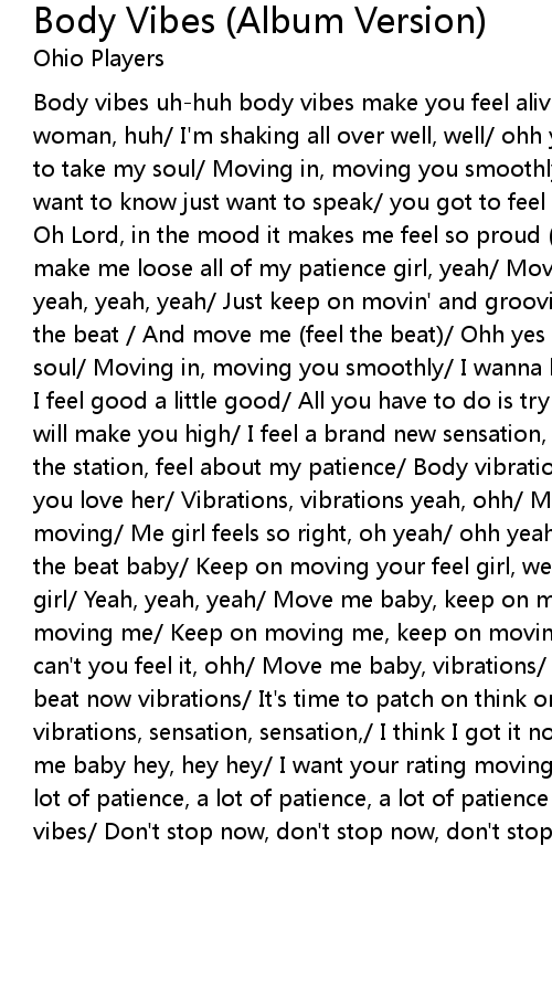 Body vibes uh-huh body vibes make you feel alive/ There ain't no jive, ohh woman, huh/ I'm shaking all over well, well/ ohh yes I wanna know, well/ Trying to take my soul/ Moving in, moving you smoothly/ It makes me feel so free/ I want to know just want to speak/ you got to feel my good body vibrations, well/ Oh Lord, in the mood it makes me feel so proud (ohh feels so proud)/ You bout to make me loose all of my patience girl, yeah/ Move me baby yeah, yeah, yeah ohh, yeah, yeah, yeah/ Just keep on movin' and groovin' me get down on me "G" feel the beat / And move me (feel the beat)/ Ohh yes I wanna know/ Trying to take my soul/ Moving in, moving you smoothly/ I wanna know just want to speak/ Feel you, I feel good a little good/ All you have to do is try I realize the/ body vibes will make you high/ I feel a brand new sensation, some new situation/ Feel about the station, feel about my patience/ Body vibrations, yeah, well, well, well Do you love her/ Vibrations, vibrations yeah, ohh/ Move me baby, woman keep on moving/ Me girl feels so right, oh yeah/ ohh yeah, yeah, yeah/ Can't you feel the beat baby/ Keep on moving your feel girl, well/ Can't you feel the beat, girl/ Yeah, yeah, yeah/ Move me baby, keep on moving me girl/ Yeah, yeah keep on moving me/ Keep on moving me, keep on moving me baby/ Woman you move me baby can't you feel it, ohh/ Move me baby, vibrations/ I think I think I feel the beat now vibrations/ It's time to patch on think on feet/ vibrations, vibrations, sensation, sensation,/ I think I got it now, c'mon vibrations/ Move me baby hey, hey hey/ I want your rating moving, I want your rating loving/ A lot of patience, a lot of patience, a lot of patience In the mood/ Ohh body vibes/ Don't stop now, don't stop now, don't stop now, Shucks! |