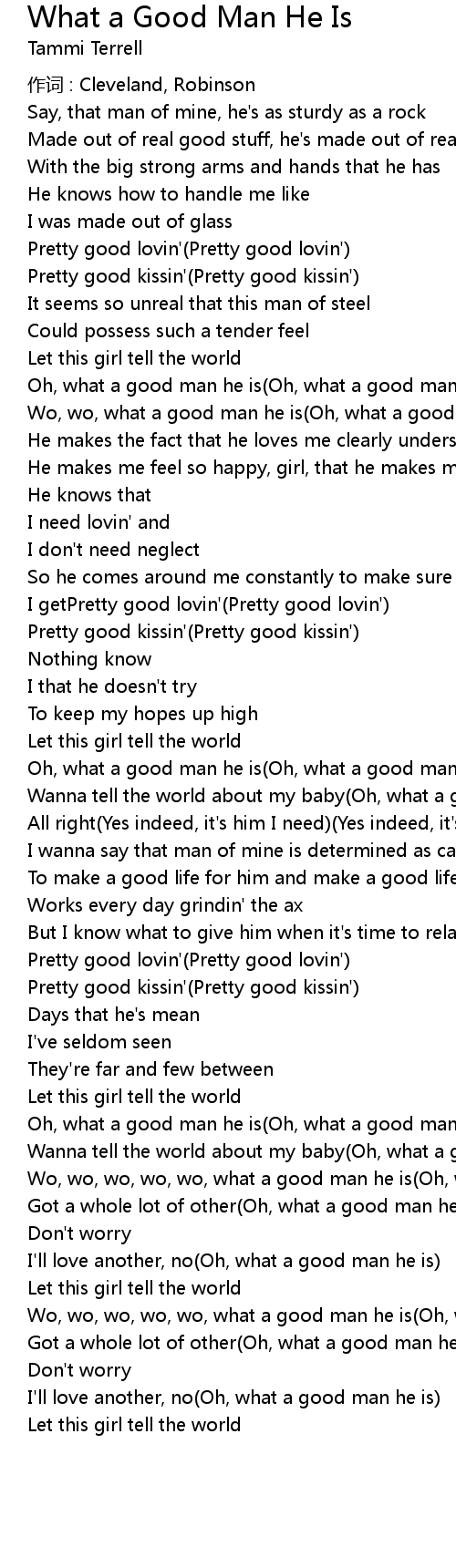 | Wo, wo, what a good man he is(Oh, what a good he is) | |