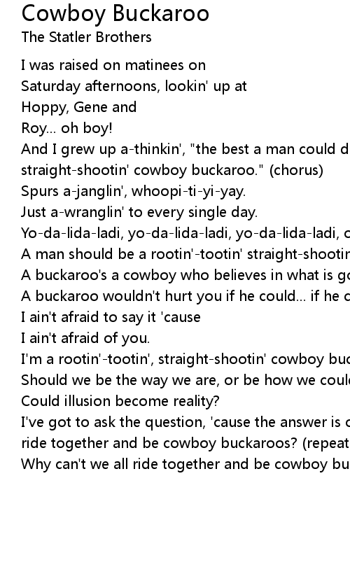 And I grew up a-thinkin', "the best a man could do is be a rootin'-tootin' straight-shootin' cowboy buckaroo." (chorus) |