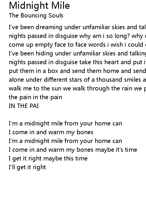 I've been hiding under unfamiliar skies and talking to strangers lossed in nights passed in disguise take this heart and put it with my bones (woahhh) and put them in a box and send them home and send them home we've been dreaming alone under different stars of a thousand smiles and of a thousand scars you walk me to the sun we walk through the rain we pass through the love and bask in the pain in the pain |