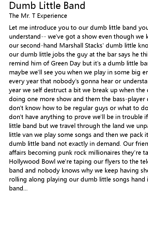 Let me introduce you to our dumb little band you might find it hard to understand-- we've got a show even though we know no one's gonna go we'll crank our second-hand Marshall Stacks' dumb little knobs we're paying for them with our dumb little jobs the guy at the bar says he thinks we're okay we kind of remind him of Green Day but it's a dumb little band and there's not much to say maybe we'll see you when we play in some big empty room one day we do a record every year that nobody's gonna hear or understand -- a dumb little band. Every year we self destruct a bit we break up when the drummer quits we talk him into doing one more show and them the bass-player quits and we break up again we don't know how to be regular guys or what to do with our dumb little lives we don't have anything to prove we'll be in trouble if we ever do cause it's a dumb little band but we travel through the land we unpack all our stuff from our dumb little van we play some songs and then we pack it up again hand in hand -- a dumb little band not exactly in demand. Our friends are all busy with their own affairs becoming punk rock millionaires they're taping their live album at the Hollywood Bowl we're taping our flyers to the telephone pole it's a dumb little band and nobody knows why we keep having shows even though nobody goes we keep rolling along playing our dumb little songs hand in hand -- a dumb little band... |