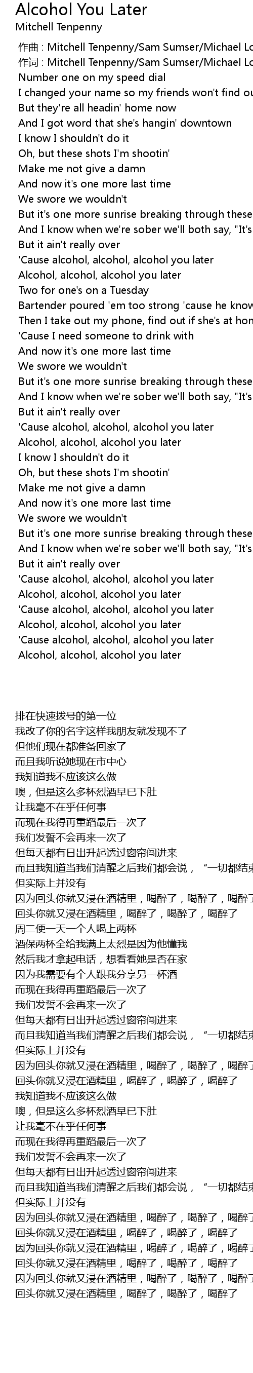 | [01:45.681] | ' Cause alcohol, alcohol, alcohol you later |