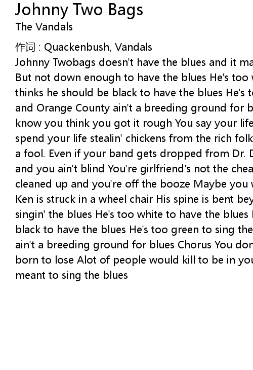 | Johnny Twobags doesn' t have the blues and it makes him sad Brings him down | |