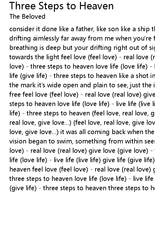 consider it done like a father, like son like a ship that is lost at sea, drifting aimlessly far away from me when you're falling asleep and your breathing is deep but your drifting right out of sight into darkest night go towards the light feel love (feel love) - real love (real love) give love (give love) - three steps to heaven love life (love life) - live life (live life) give life (give life) - three steps to heaven like a shot in the dark, i was wide of the mark it's wide open and plain to see, just the inner me, trying to break free feel love (feel love) - real love (real love) give love (give love) - three steps to heaven love life (love life) - live life (live life) give life (give life) - three steps to heaven (feel love, real love, give love...) (feel love, real love, give love...) (feel love, real love, give love...) (feel love, real love, give love...) it was all coming back when the image turned black and my vision began to swim, something from within seemed to pull me in feel love (feel love) - real love (real love) give love (give love) - three steps to heaven love life (love life) - live life (live life) give life (give life) - three steps to heaven feel love (feel love) - real love (real love) give love (give love) - three steps to heaven love life (love life) - live life (live life) give life (give life) - three steps to heaven three steps to heaven... |