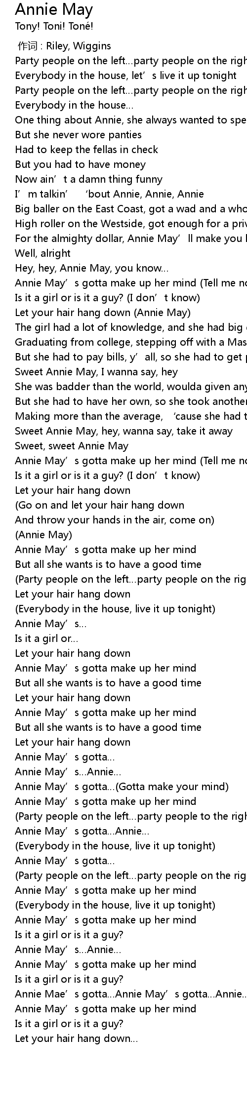 | [05:23.749] | Annie Mae' s gotta Annie May' s gotta Annie |
